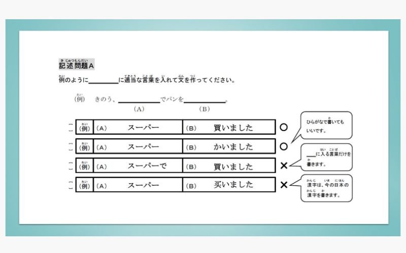 A partir do nível D-E (N4 e N3 do JLPT) há 6 questões de completar as frases (segundo as situações apresentadas) que o candidato deve escrever à mão. Mas não precisam ser escritas usando kanji (ideogramas). Aliás, o que está sendo avaliado aqui é se o candidato escreve de forma correta e legível as escritas hiragana e katakana, além, é claro, do conhecimento de gramática. Abaixo se encontram os critérios de correções dessa parte. Toda correção é feita no Japão por pelo menos 2 professores de língua japonesa.